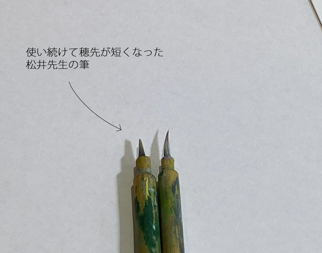 そして、私は筆は消耗品と思っていて、比較的早く新しい筆に交換してしまうのですが、松井先生は違いました。