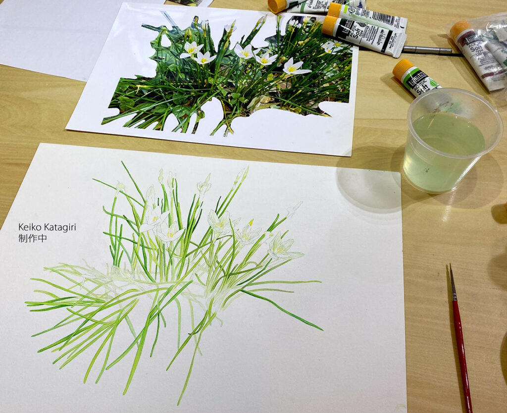 私は、ゆっくりゆっくり描いています。 細かい花は描くのに時間がかかるので5枚の花びらのタマスダレにしましたが、うーん、葉っぱが沢山あって、やっぱり描くことに時間がかかっています。