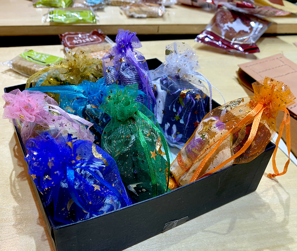 ウッチーのお母様が作られたお手玉。可愛らしい袋に入っていて、とってもいい匂い。ラベンダーの香りがする。