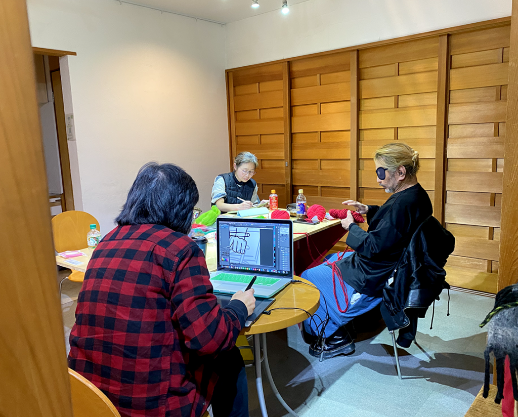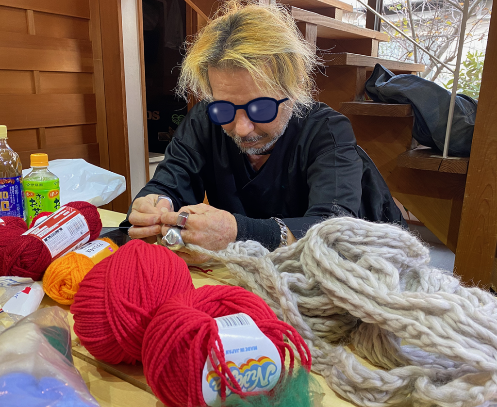 毛糸に取り囲まれた大森さん。手で編む編み物に挑戦中。