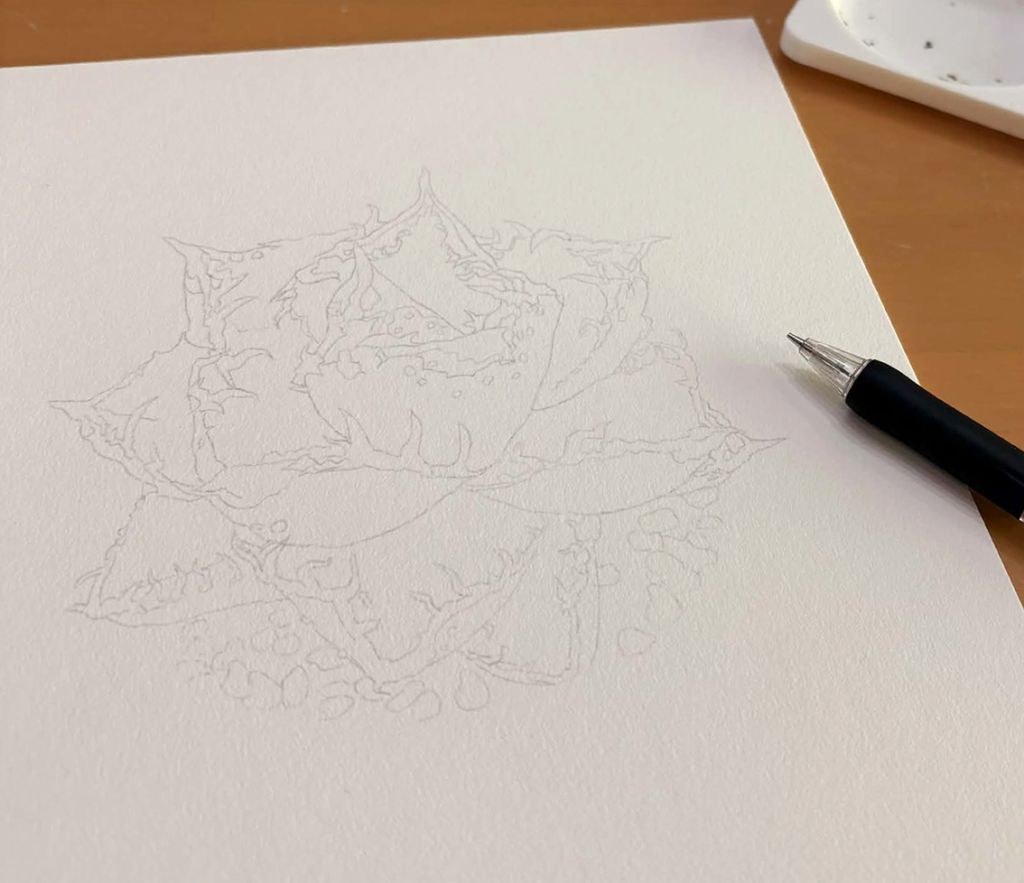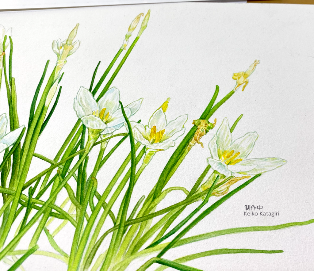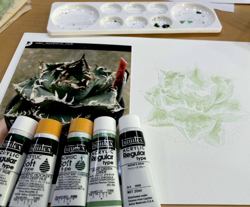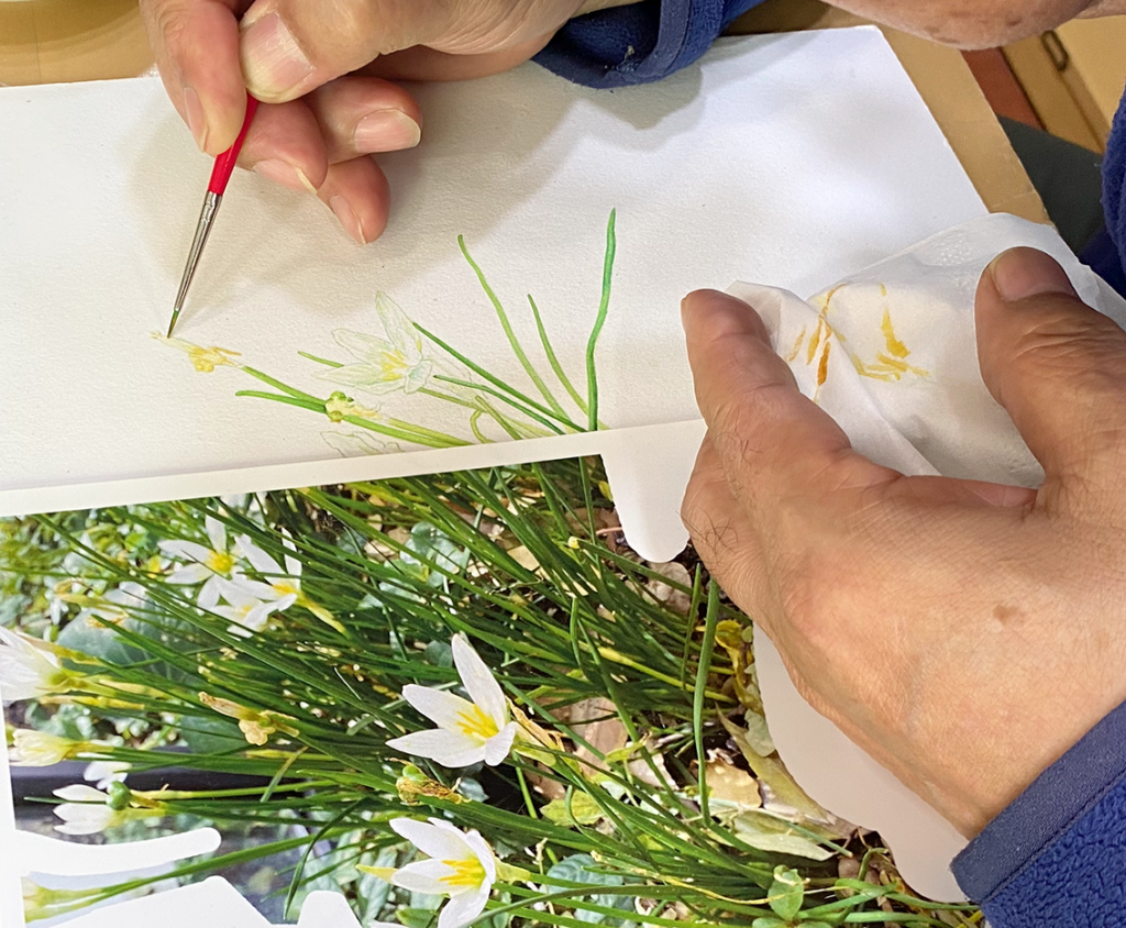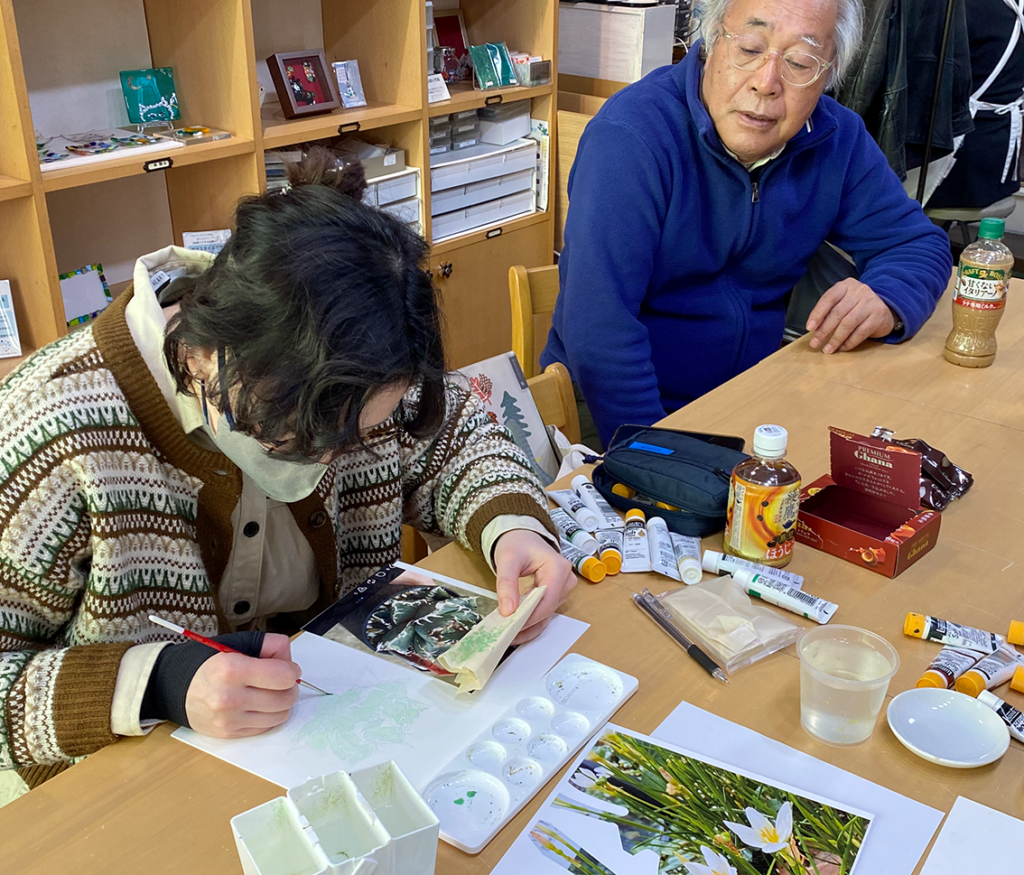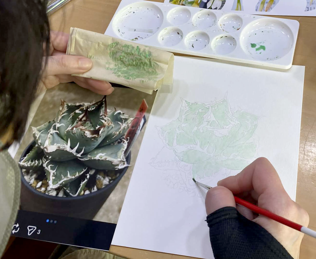 奇数月の第3土曜日に開催することになった植物画教室。春を迎えていろいろな花が咲き始める中、私はいつまでも同じ花に取り組んでいます。 制作スピードが私より早いミヤチは今日から新作に取り組むことになって、早くも色をつけ始めました。